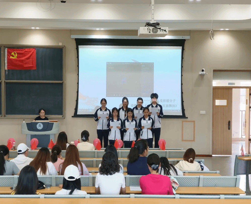 活动在庄严的国歌声中正式开始,全体党员肃立齐唱,表达爱国情怀。随后,诗歌朗诵《山河赋色·红旗飘扬》深情回顾了中国人民在红旗指引下的奋斗历程,坚定了党员“永远跟党走”的信念。政治理论学习环节,学生党员们深入学习了习近平总书记给谢依特小学戍边支教西部计划志愿者服务队队员的回信精神,习近平总书记充分肯定了西部计划志愿者扎根边疆、服务基层的奉献精神,勉励广大青年“到基层和人民中去建功立业,让青春之花绽放在祖国最需要的地方”。最后,大家还分享感悟,同学们表示发挥自身的专业优势,积极参与支教、社区服务、乡村振兴等志愿服务,以实际行动践行新时代青年的使命担当。
