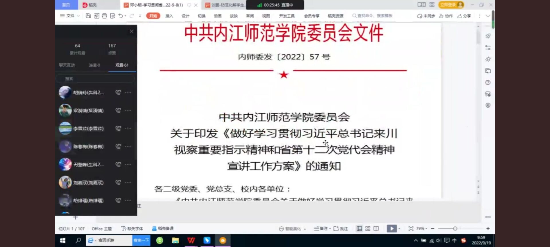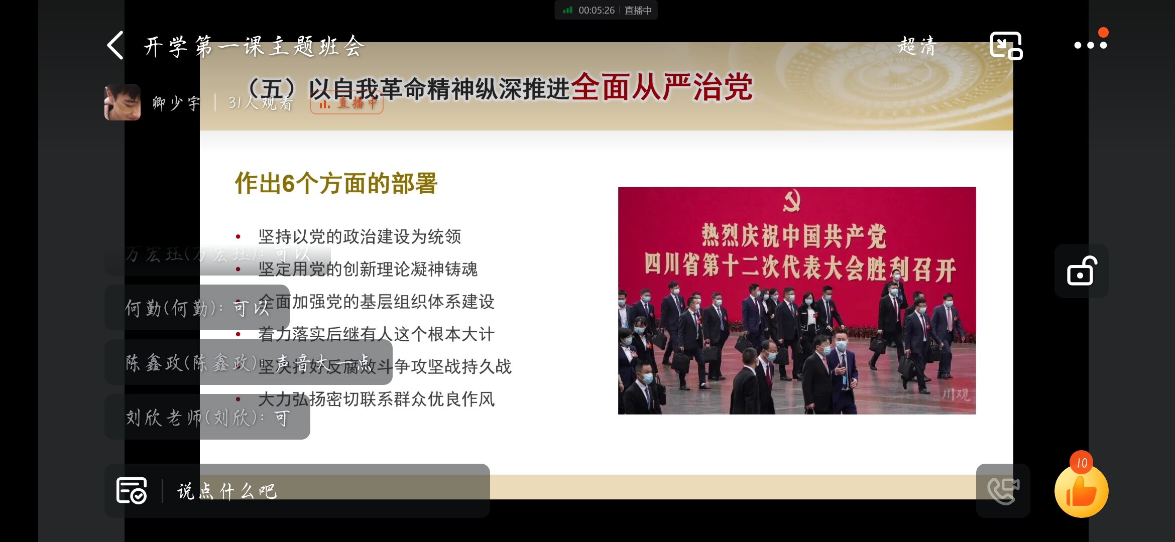 2022年9月11日-20日,k1体育娱乐平台各班班主任通过钉钉会议、钉钉直播和腾讯会议等多种方式开展了“开学第一课”主题班会。班会围绕两个主题展开,一是关于《学习贯彻习近平总书记来川视察重要指示精神和四川省第十二次党代会精神以实际行动迎接党的二十大胜利召开》的政治学习,二是《防范化解学生安全风险》的安全教育。
