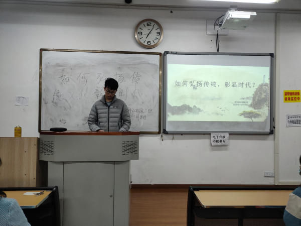 班会的开始,主持人陈长清首先讲到当代大学生为什么要弘扬传统文化。弘扬传统文化不是复古,不是排外,而是认真对待古代的、外国的一切先进的东西,善于利用那些有积极意义的东西。很多人似乎只是学一些皮毛,甚至是学了糟粕。要经过比较和鉴别,抓住精髓,把对传统文化的爱与自身的行动统一起来。其次谈到了怎样弘扬传统,要培育与弘扬解放思想、实事求是、与时俱进、开拓创新、知难而进、艰苦奋斗、自强不息、清正廉洁、永不自满,乐于奉献等的民族精神,不落于时代而不断发展;不囿于陈规而勇于创新;不敢于骄傲而奋发向上,为全面建设小康社会,为振兴中华的民族精神。最后主持人陈长清让同学们谈谈自己的看法,对此大家都积极地参与到讨论中,提出自己的观点和看法。