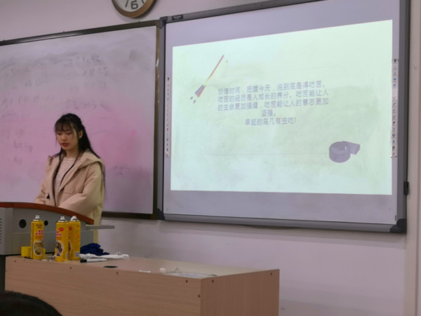 会议开始,班长以猜谜底的形式引出我们本次班会的主题“时间”,并且对同学们提问“谁能记得父母生日与电话”互动,同学们对此非常积极。同时,同学们也意识到,应当时刻记住父母的生日和电话。随后,班长播放了一段珍惜时间、珍惜父母的时间的视频,并对所在学校上一节课需要花费父母多少血汗钱来激励学生们要好好学习。作为一名子女,作为一名学生,我们要对得起父母的付出,感谢父母无私的爱。最后,由男生宿舍312为我们带来歌曲《滴答》,在聆听这首歌曲后,同学们对时间的概念更加清晰起来,意识到时间对于大家的重要性,我们应该珍惜时间、不能浪费它。本次会议的气氛非常活跃,秩序良好,同学们主动地参与其中,并且积极主动的思考主持提出的问题。