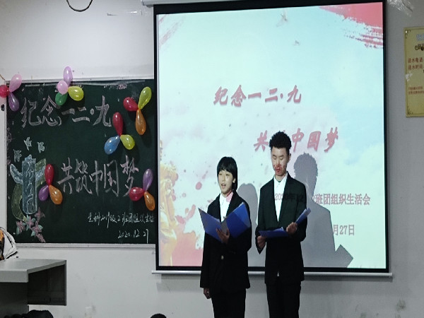 会议开始,主持人罗雪、许淋虹致开场词,宣布本次以“纪念一二·九共筑中国梦”为主题的团组织正式开始。并由主持人带领大家一起了解活动的背景。接下来由邵莉雯同学为大家讲述一二·九运动的经过与意义,带领大家一起回顾历史。王显桢、刘治兵、陈学三位同学通过观看视频谈了谈自己对于纪录片的想法和感受。这三位同学都提及到要传承革命精神和爱国主义精神,我们作为青年人这是我们的责任也是我们的义务。紧接着由史霞、孙明伟等几位同学为大家带来了《少年中国说》诗词朗诵。以此来激发同学们的爱国主义热情,并弘扬爱国主义、弘扬革命传统。接下来由李坤洋、杨淋二位同学为大家带来《平凡之路》的吉他弹唱。在安稳的旋律中享受平静与纯真,透过歌曲的力量带着对未知前路的期许,前往自己想去的未来。然后就到了激动人心的游戏环节,挤压气球。游戏过后,由杨闵芳,刘云兰等几位同学各大家带来手语操《国家》的表演。同学们也感到非常震撼。活动也接近了尾声,由主持人带领大家宣誓。