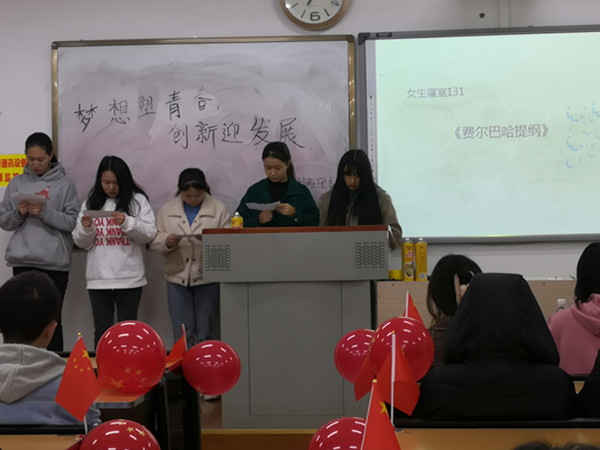 为了推动校园文化建设,全面贯彻社会主义核心价值观,紧紧围绕着学校“笃行,创新”的主题,培养学生的创新精神,丰富校园文化生活,构建和谐校园。我班于2020年11月29日星期日晚上7点第五教学楼北701开展了”梦想塑青春,创新迎发展“的主题。由魏杰、刘裕两位同学主持,宣传委员吴金莲作记录。