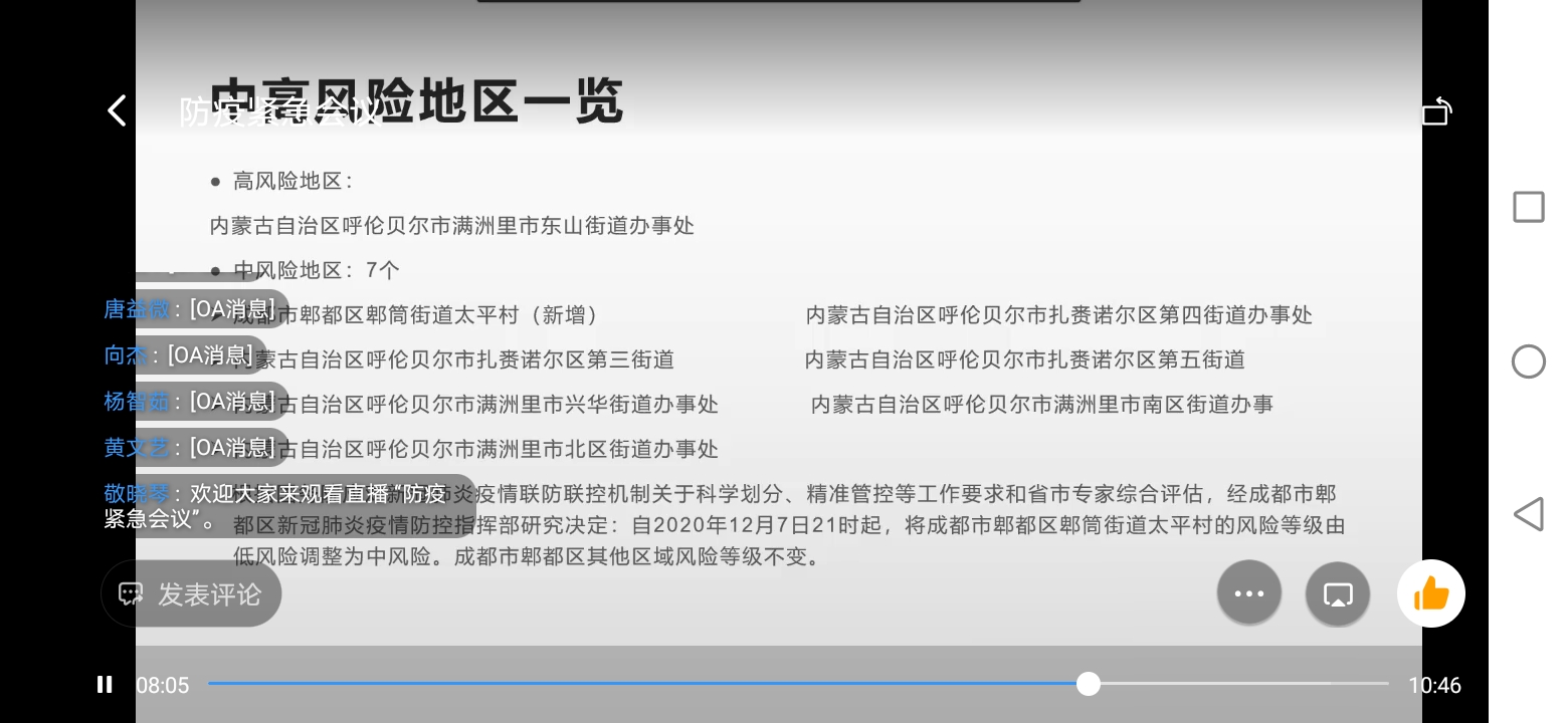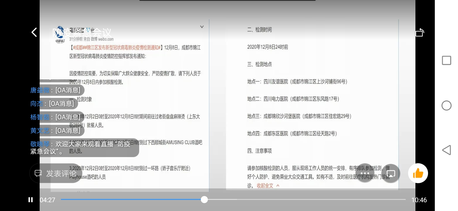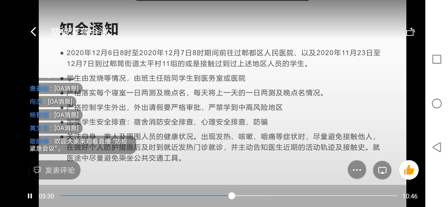 会上,敬晓琴同学为我们详细讲解了此次紧急会议召开的原因,并做出以下通知:凡是2020年12月6日8时至2020年12月7日8时期间前往过郫都区人民医院、以及2020年11月23日至12月7日到过郫筒街道太平村11组的或是接触过到过上述地区人员的学生,应主动上报,配合检查工作。学生若出现发烧等情况,应由班主任陪同学生到医务室或医院进行检查。严格落实各寝室一日两测及晚点名,每天晚上及时上报一日两测及晚点名情况。严格控制学生外出,外出请假要严格审批,严禁学生到中高风险地区活动。加强学生的防骗意识,做好宿舍消防安全排查、心理安全排查。学生应积极关注自身、家人及周围人员的健康状况。若出现发热、咳嗽、咽痛等症状时,尽量避免接触他人,在做好个人防护措施后及时到就近发热门诊就诊,并主动告知医生近期的活动轨迹及接触史。就医途中尽量避免乘坐公共交通工具。