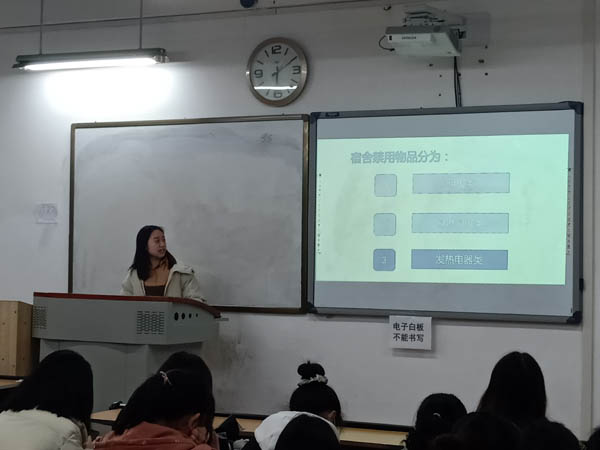 班会初始,主持人向同学们介绍了此次主题班会开展的目的和背景,即增强同学们的安全防范意识和避险能力,让同学们了解学生公寓安全常识,明白宿舍安全的重要性。此次班会分为公寓安全真实案例、认识安全的重要性、了解学生公寓禁用物品以及预防安全隐患发生四个部分。首先,主持人讲述了一些真实发生过的学生公寓安全案例,分析了这些案例发生的原因。然后,主持人通过这些案例让同学们认识学生公寓中存在的安全问题,意识到安全的重要性,提高同学们的安全防范意识。接着,主持人介绍了在学生公寓中的禁用物品,这些禁用物品主要分为明火类、易燃易爆类以及发热电器类三类,其中大功率电器是严令禁止的,主持人让同学们意识到使用大功率电器的危害,提高了同学们的安全用电意识,并对同学们日常生活中的用电习惯提出了一定建议,引导同学们养成良好的用电习惯。最后,主持人列举了存在于学生公寓中的各种安全隐患,并讲述了解决应对的方法,让同学们时刻加强安全意识,增强同学们的自我防范意识,做到警钟长鸣。