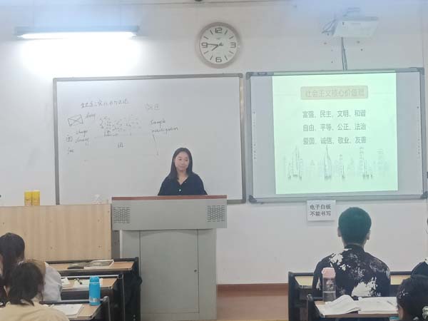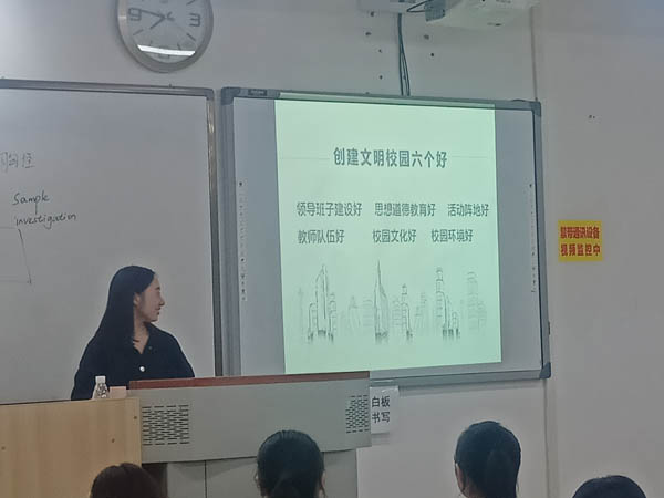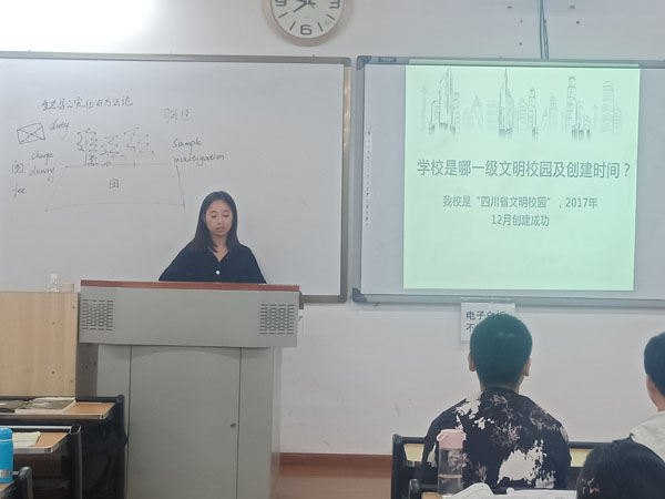 班会初始,主持人向同学们介绍了此次主题班会开展的目的和意义,即学会创建第五届四川省文明城市应知应会小知识,共建文明校园。在班会过程中,主持人首先为同学们介绍了社会主义核心价值观的内容,讲解了社会主义核心价值观的三个层面,带领同学们一起记忆社会主义核心价值观。同学们通过对社会主义核心价值观的学习,能够时刻牢记社会主义核心价值观,培养正确的价值观。然后,主持人向同学们讲述了“创建文明校园的六个好”,领导班子建设好,思想道德建设好,活动阵地好,教师队伍好,校园文化好和校园文化好。创建文明校园的六个好向同学们充分展示了建设文明校园需要做好哪些方面的工作,让同学们知道建设文明校园的不易。之后,主持人又向同学们介绍了学校围绕文明校园建设开展了文明知识普及工作,文明环境治理工作,校园文化品牌打造以及文明素养提升工程等活动。主持人的介绍让同学们知道了学校对创建文明校园做出的工作以及学校对创建文明校园的重视。最后,主持人让同学们清楚我校是于2017年12月创建“四川省文明校园”成功。