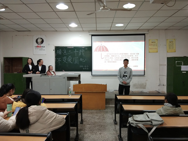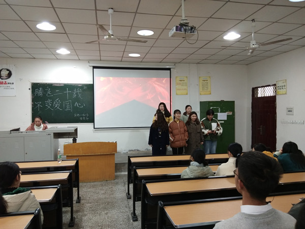 活动开始后,主持人为大家介绍本次团组织生活会的活动背景:今年是澳门回归祖国20周年,1999年12月20日零时,中国政府对澳门恢复行使主权。回归祖国的怀抱,澳门的发展从此进入了一个崭新的时代。今年12月20日,澳门迎来了回归祖国的第20年,这20年,澳门的经济迅速发展,向世界证明了“一国两制”的不凡成就。接着,由女生寝室111为大家带来歌曲《七子之歌·澳门》,激情献唱仿佛又带领大家回到了以前那个令人刻骨铭心的年代。然后,再调动起同学们的情感,营造活动的氛围后,就进入三个环节——知识竞答。之后,由主持人为大家放映一段视频《庆祝澳门回归二十周年:澳门记忆2000》,并让同学们通过感悟观看的视频内容并分享自己的心得体会。紧接着,就进入最令人兴奋的游戏环节——成语接龙。由全班同学一起完成,参与度高而且充分调动其同学们的参与热情。最后,孙朝杨同学演唱的“隐形的翅膀”悄悄地将此次团组织生活会拉入尾声。