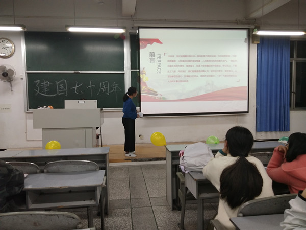 2019年,我们隆重庆祝中华人民共和国70周年华诞。70年披荆斩棘,70年风雨兼程。一路走来,中国人民自力更生,艰苦奋斗,创造了举世瞩目的中国奇迹。班会伊始,主持人为我们讲述此次班会的目的,以近期庆祝祖国七十周年华诞为活动背景,带同学们一同浏览从初建国至今的奋斗历史。之后,主持人推出从1949年建国,1964年我国第一颗原子弹实验成功,1970年东方红一号卫星发射成功,1997年香港回归祖国,1999年澳门回归祖国,2008年北京奥运会成功举办,2013年神舟十号飞船发射成功,2016年位于贵州的“天眼”落成启用,2017年复兴号动车组列车正式首发等等举世成就。桩桩件件无一不令人心情澎湃,热泪盈眶。不由得让人生出无尽的自豪和自信,这就是祖国的力量。接着,主持人在同学们分享自己的心情后放映出一段记录祖国大好河山的视频。巍峨秀丽的山川、壮丽的景色、庄严肃穆的建筑、充满朝气和现代化气息的城市,随着高昂的音乐一幕接一幕得展现在我们面前。于其中所感受到的震撼已难以用言语来形容。班会的最后是同学们讨论的环节,以我国先辈们在科技方面取得成就为题,分享自己所知所得。