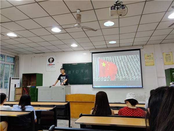 活动开始,团支书刘旭首先提出以“我与祖国共奋进”为主题,围绕学习贯彻习近平总书记在纪念五四运动100周年大会上的重要讲话精神,结合自己的个人学习、工作经历,为大家进行了慷慨激昂的演讲。并表示今年是“九一八”事变的88周年,我们应该勿忘国耻,铭记历史,缅怀先烈,珍爱和平。随后由班长翁泽鹍发言:“我记得有一首歌是这样唱的‘一把黄土塑成千万个你我,静脉是长城,动脉是黄河;黑眼睛,黄皮肤,提醒你,也提醒我,我们拥有一个共同的名字,那就是中国!’”他表示每当听到这首歌时,一种强烈的情感从心里升起,我骄傲,我自豪,因为我是中国人!随后活动在《我的祖国》这首歌声中结束。