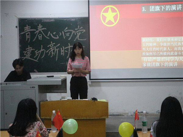 活动的开始,我们庄严肃立,一同歌唱国歌。随后,观看了“纪念五四运动100周年”主题微团课的视频。在中共领导下,在五四精神的激励和感召下,无数优秀的中华儿女为争取民族独立和人民解放,建立了不朽功勋。今日,我们观看视频,了解先辈故事,感受五四文化。视频结束,优秀团员代表严慧君同学发表了演讲,内容包括倡导人们争当民族复兴的时代新人等。下一个环节,团支书廖春华带领全体同学重温入团誓词。宣誓完毕后,班主任温亚老师上台对同学进行寄语,表达了自己的期盼。最后,我们歌唱团歌,写下本次活动的感想,并进行交流。