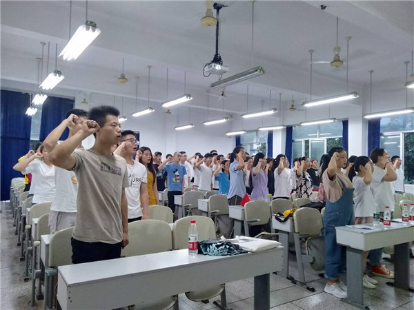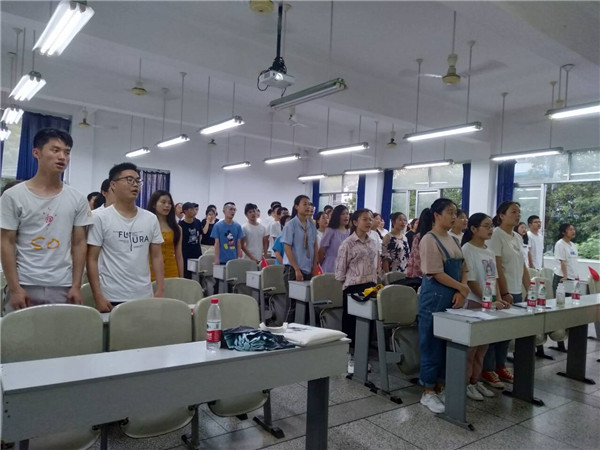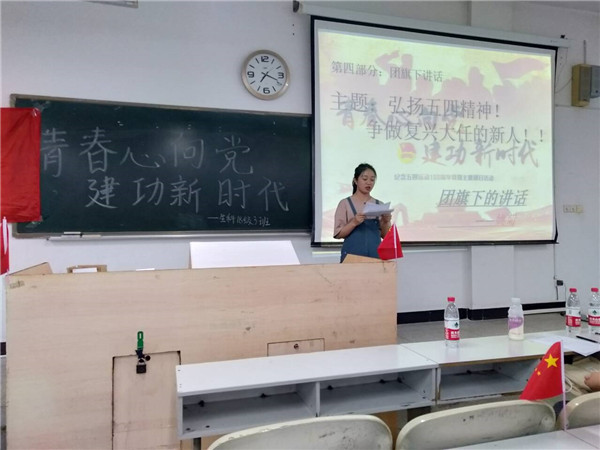 活动首先,由主持人带领全体同学齐唱国歌,为纪念新中国成立70周年以及五四运动100周年。随后,为学习五四运动中的革命先烈的爱国主义精神,追忆革命故事,缅怀英雄先烈,传承五四精神,全体同学一同观看了“纪念五四运动 100周年”主题微团课。接着,由学习委员姚菊同学为大家带来了团旗下演讲,声情并茂的演讲使同学们振奋不已。然后,由团支书张利花同学带领共青团员重温入团誓词。宣誓结束后,全班同学齐唱团歌《光荣啊,中国共青团》,熟悉的歌词在耳边萦绕,先辈的事迹在脑海里回放。活动最后,由班主任邹远超老师做会议总结,邹老师表示,希望同学们能牢记自身的使命,不忘初心,成为一名合格的共产主义接班人。