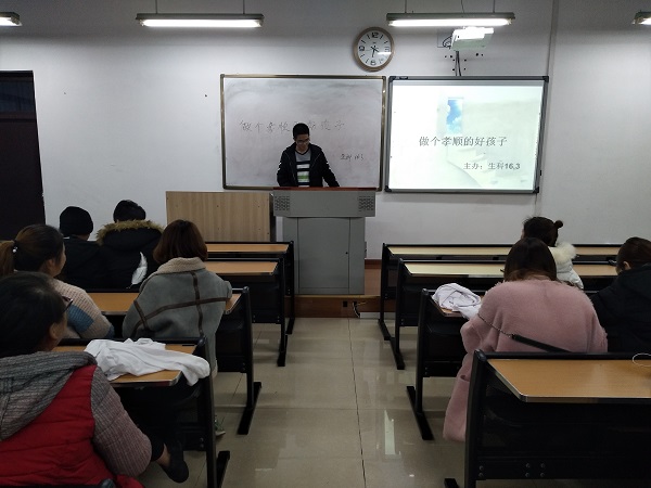 为了使同学们树立孝顺父母的意识,认识到孝顺父母的重要性,激发学生今后在家多理解父母,多与父母沟通交流,做个孝顺的好孩子,从点滴做起,从我做起,从现在做起。2018年10月21日,2016级3班于第五教学楼北502举行了关于“做个孝顺的好孩子”的主题班会,本次班会由杨环同学主持,2016级3班全体同学共同参与。