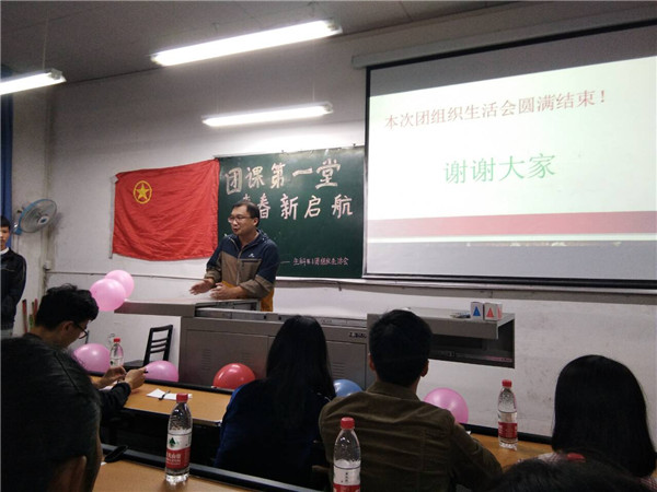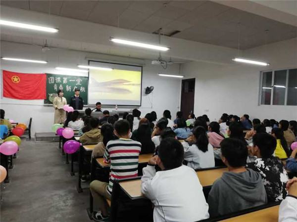为响应基层团组织的号召,贯彻落实习总书记的讲话,9月28日下午七点整,2018级1班在一教101开展了以“团课第一堂,青春新启航”为主题的团组织生活会,本次活动由陈方山同学和刁雪同学主持,18级2班全体同学、班主任温亚老师和团总支学生会组织部的同学们以及校团委副书记张楠博士共同参与