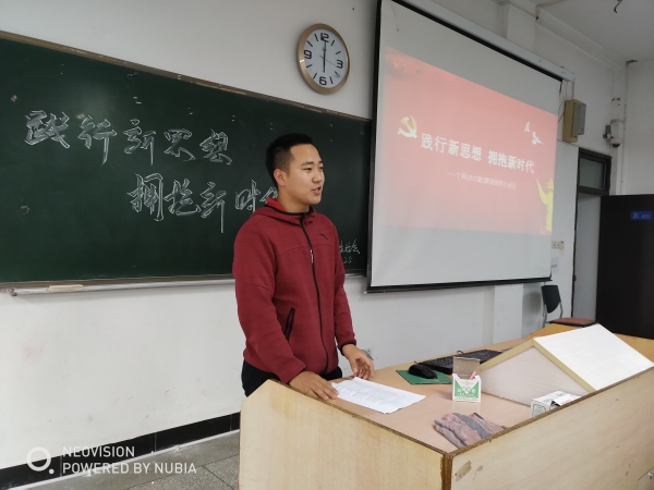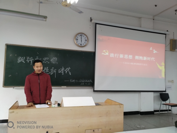 3月25日,本班于第五教学楼北楼401教室召开了以《践行新思想,拥抱新时代》为主题的团组织生活会,本次团组织生活会由我班209寝室举行,由艾雪峰同学主持,由班主任李武老师进行指导。