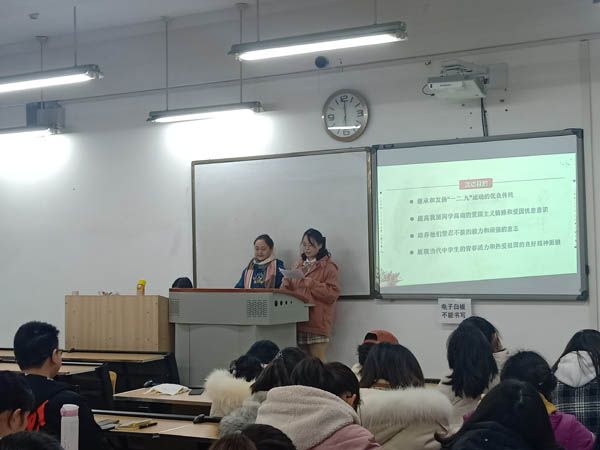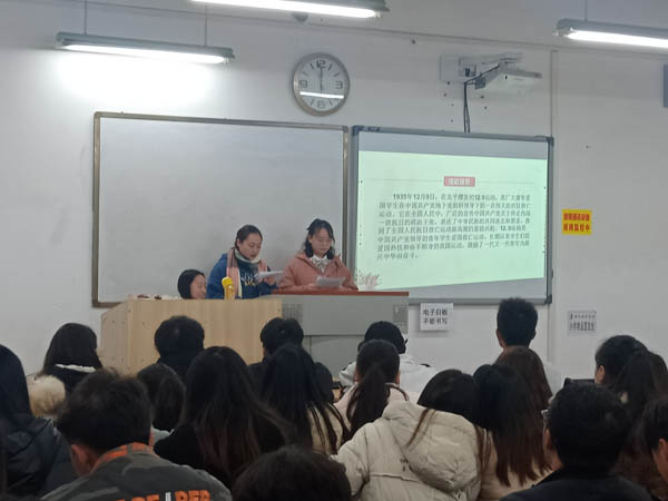 为继承和发扬“一二·九”运动精神,培养大学生的爱国主义精神,以及他们顽强的意志和坚忍不拔的毅力,提高大学生的爱国主义情怀。生科2018级1班团支部特于2020年12月27日晚18:00整,在五教北502开展了以“纪念一二·九,共筑中国梦”为主题的团组织生活会,由姚泓倩同学和钟君同学担任主持人,本次团组织生活会由班主任胡婷婷老师生科和2018级1班全体成员共同参与。